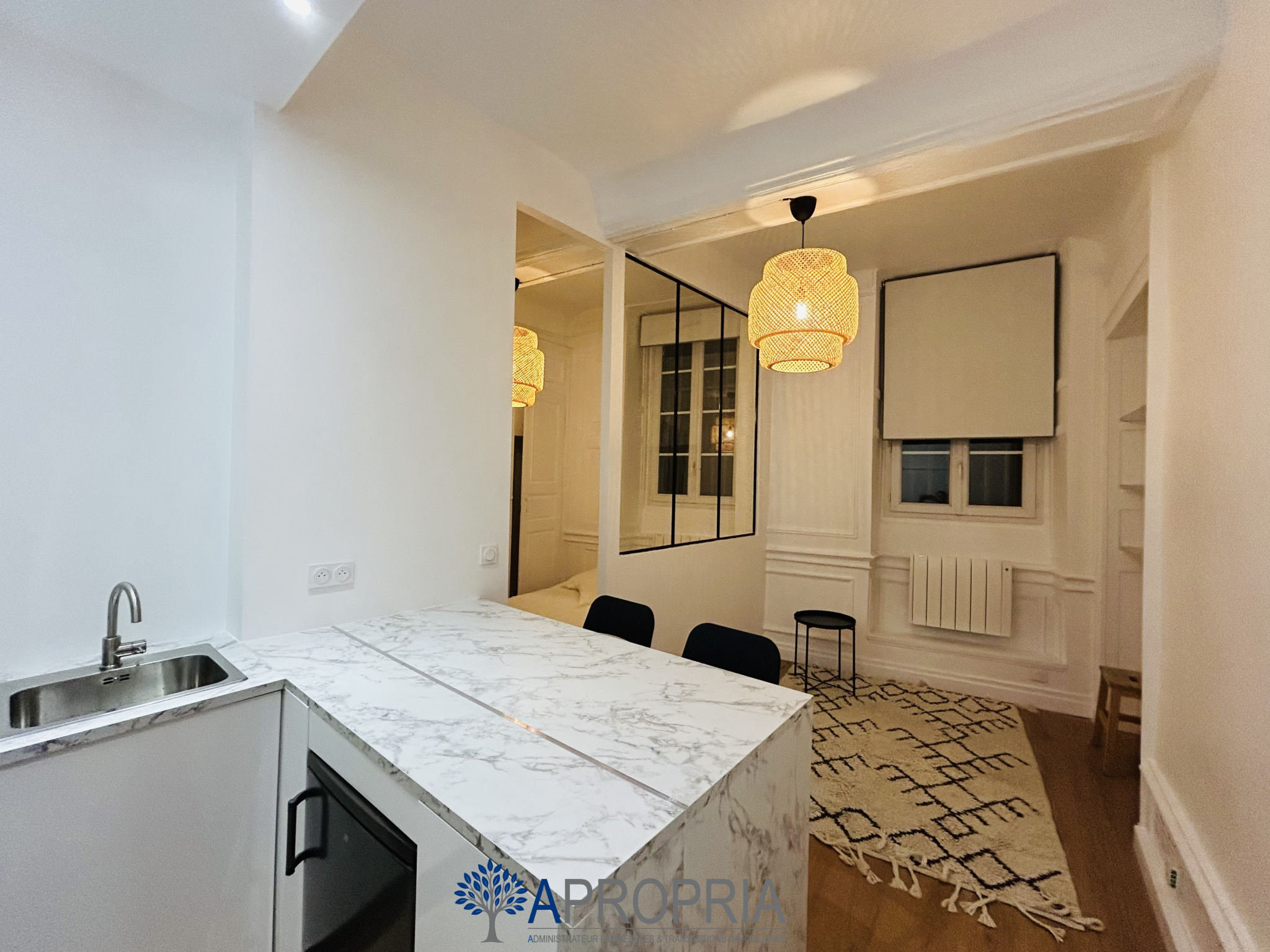 L’appartement se compose d’une pièce principale intelligemment aménagée, offrant plusieurs espaces distincts :