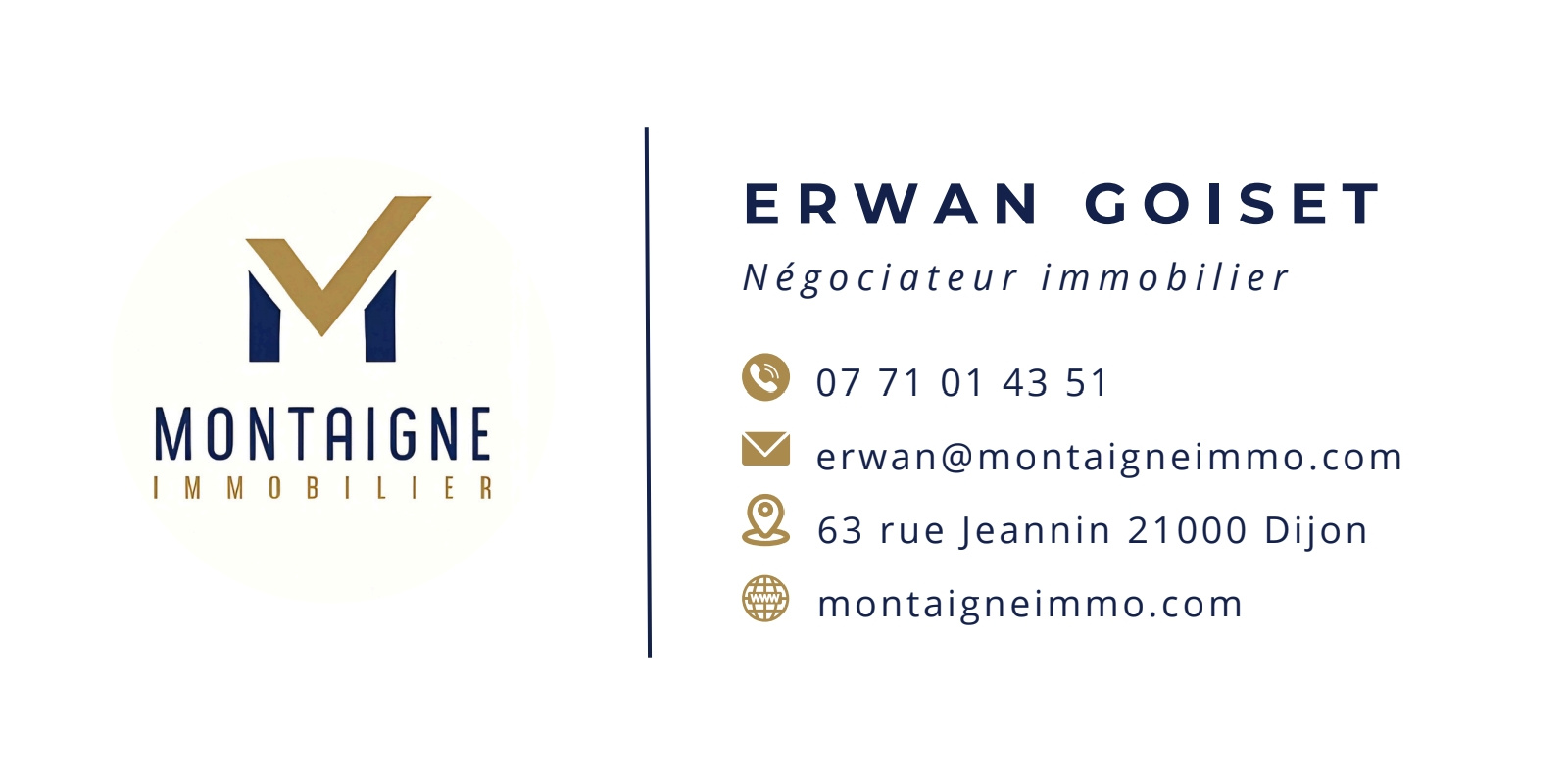 MONTAIGNE IMMOBILIER, exploitée par la société MONTAIGNE IMMOBILIER, SARL, dont le siège social est situé 63 rue Jeannin 21000 DIJON, immatriculée au RCS DIJON n° 53988964200044, titulaire de la carte professionnelle sous le n° CPI 2102 2018 000 031 041